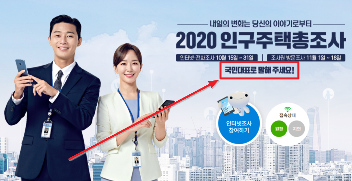 2020년 10월15일부터 우리나라에 사는 모든 내.외국인과 주택의 규모 및 특징을 알기위해서 국가의 기본적인 통계조사인 "인구주택총조사"가 이루어집니다. 그런데 인구주택총조사 밑에 "국민대표로 말해 주세요" 라는 글이 보입니다.