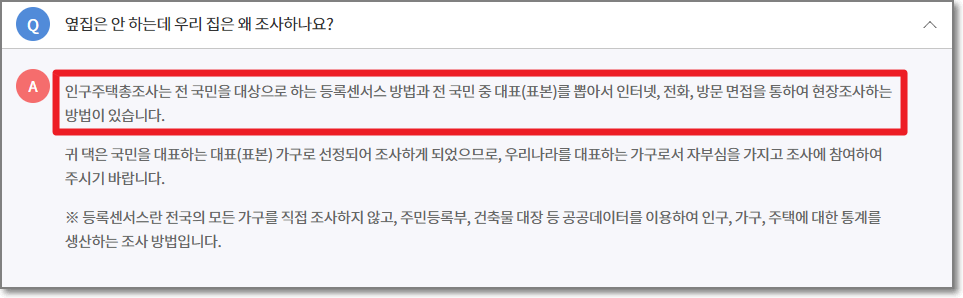 "전 국민을 대상으로 하는 등록센서스 방법"과 전 국민중 대표(표본)를 뽑아서 인터넷,전화,방문 면접을 통하여 현장조사하는 방법이 있다고 합니다. 이는 5년마다 등록센서스(전수조사)를 하고 나머지는 표본조사를 합니다.
