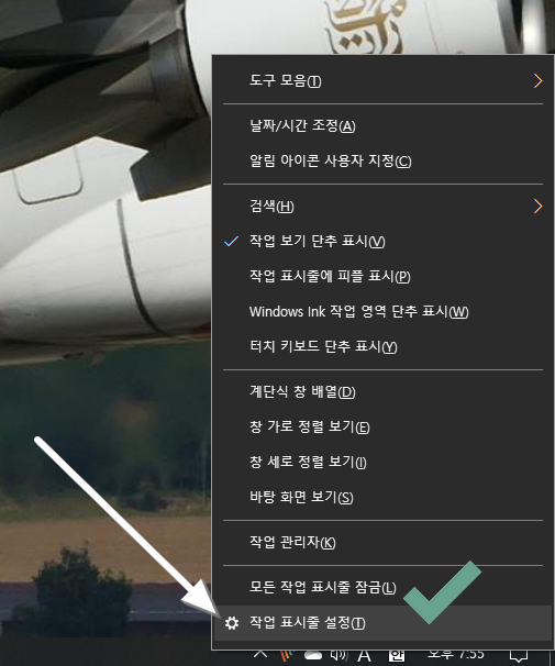 이 상태에서 마우스 오른쪽 버튼을 눌러봅니다. 그리고 "작업 표시줄 설정"을 왼쪽 클릭합니다.