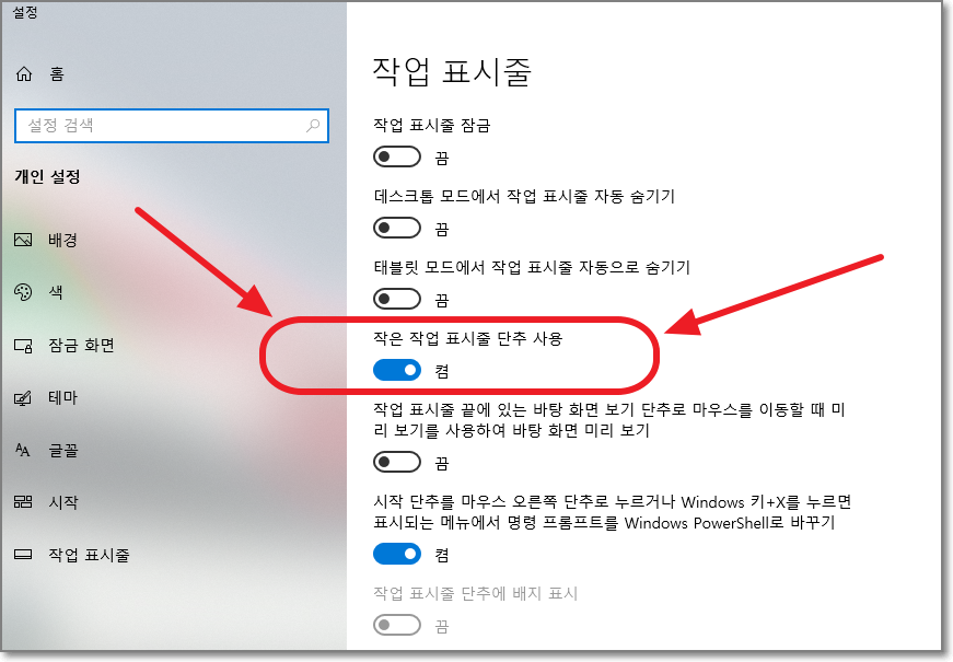 여기서 "작은 작업 표시줄 단추 사용"을 보니 "켬"으로 되어 있는 것을 볼 수 있습니다.