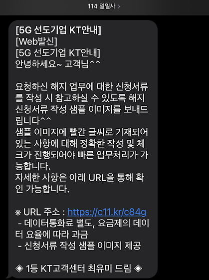 문자 내용을 보면, 요청하신 해지 업무에 대한 신청서류를 작성 시 참고하실 수 있도록 해지 신청서류 작성 샘플 이미지를 보내드립니다. 샘플 이미지에 빨간 글씨로 기재되어 있는 사항에 대해 정확한 작성 및 체크가 진행되어야 빠른 업무처리가 가능합니다. 라고 하면서 URL이 같이 옵니다. 눌러보면 아래와 같은 샘플 이미지가 온 것을 볼 수 있습니다.