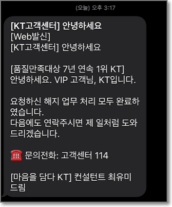 그러더니 또 1분도 안되서 아래와 같은 문자가 또 옵니다. 이번에는 상담원분의 이름이 적혀있는 것으로 보아 자동발신이 아닌 수동발신이 아닌가 하는 생각이 듭니다. 어쨋든 "업무 처리 후 확인 문자 발송하겠습니다"라고 하니 이제 문자를 기다리면 될 것 같습니다.