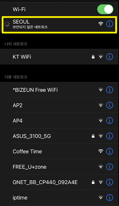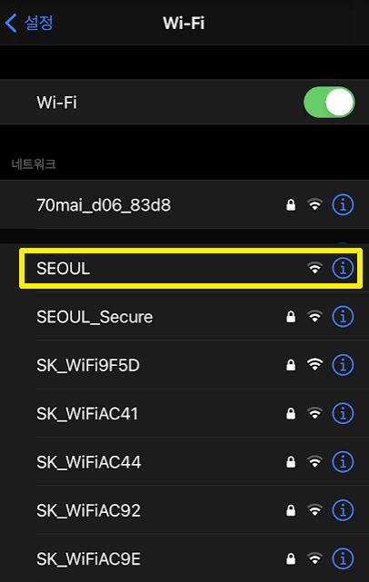 공원이나 산책로, 전통시장 그리고 주요도로에서 스마트폰 와이파이를 켜고 SEOUL을 선택하면 장소를 이동해도 그 범위에 까치온이 있다면 자동으로 계속 와이파이연결이 손바뀜 되면서 유지가 됩니다.