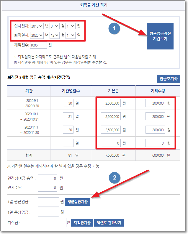 입사일자와 퇴직일자를 입력하고 "평균임금계산 기간보기"를 누르고, 퇴직전 3개월 임금 총액을 세전으로 기본급과 기타수당 포함하여 기입하고 "평균임금계산"버튼을 누릅니다.