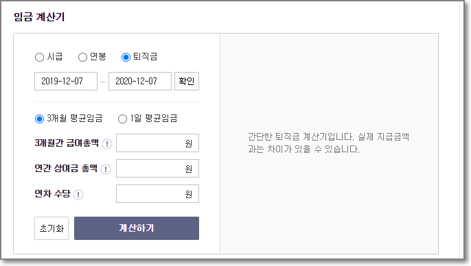 다음포털에서도 검색어를 "퇴직급 계산기"라고 치면 위와 같이 계산할 수 있는 페이지가 나오는데요.