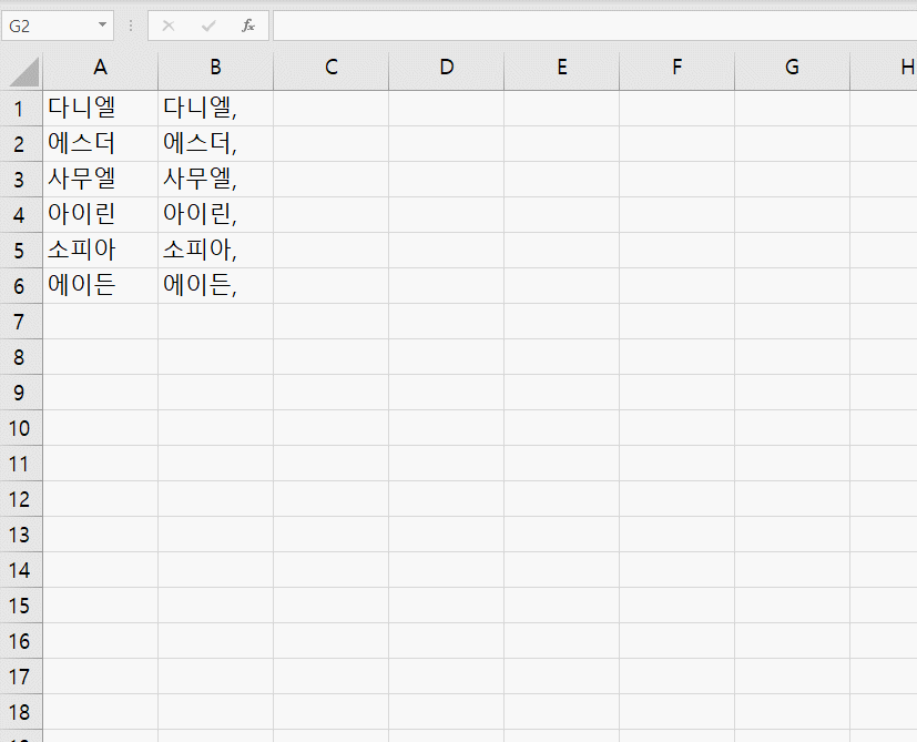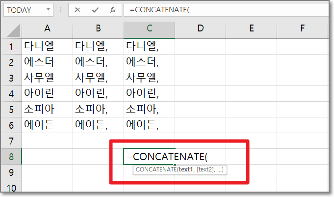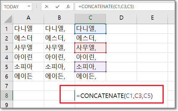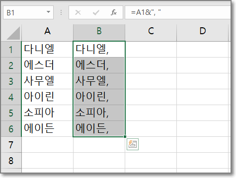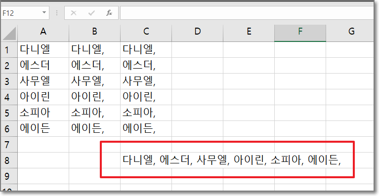 그러면 아래처럼 이름 사이에 쉼표와 빈칸이 들어간 상태로 가로로 한칸에 합쳐서 써집니다.