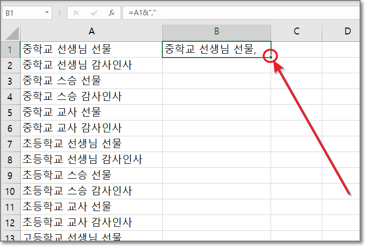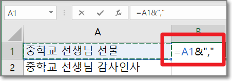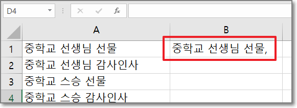 그러면 아래처럼 중학교 선생님 선물 뒤에 쉼표가 붙게 됩니다.