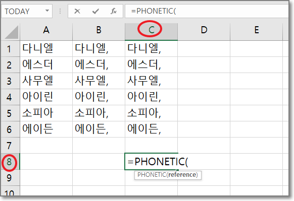 C8칸에 마우스를 클릭하고 "=PHONETIC( " 라고 입력합니다.