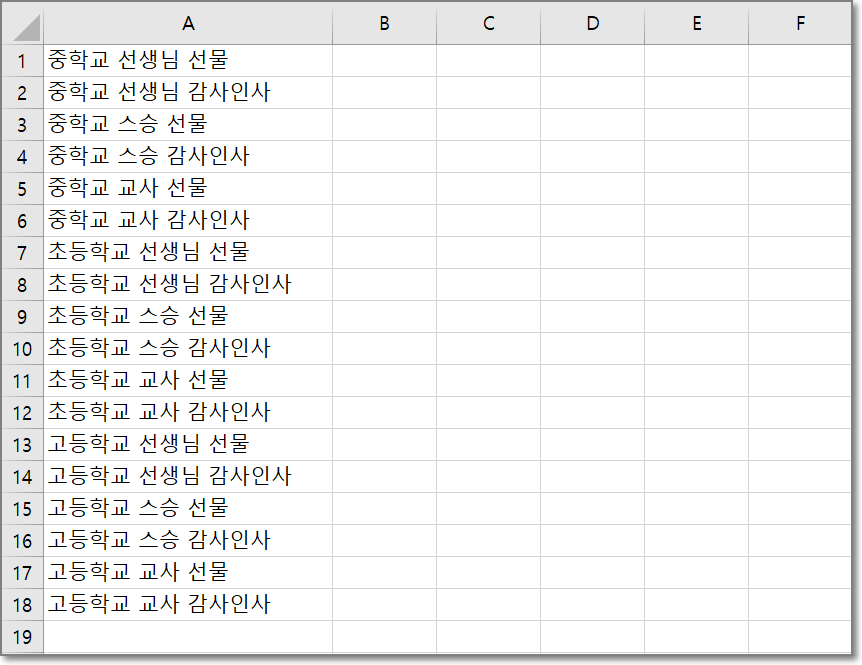 우선 위에서 예시로 나온 스승의날 관련 키워드를 엑셀 문자 합치기 기능을 보기 위해서 엑셀에 붙여넣기 했습니다.