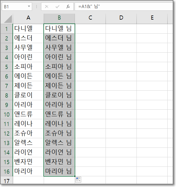 그리고 자동채우기 핸들을 끌어당기거나 두번 클릭하면 아래처럼 모든 이름에 "님"자가 붙게 됩니다.