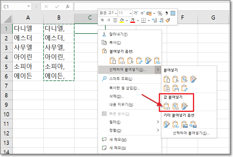 그리고 다니엘부터 에이든까지 마우스로 긁어서 Ctrl+C로 복사를 하고 C1에서 오른쪽 마우스를 누르고 값 붙여넣기를 해줍니다.