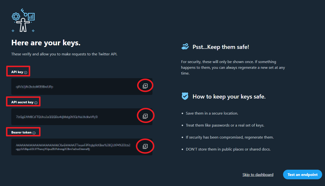 이제 API key, API secret key, Bearer token 값이 나왔습니다. 해당 값을 복사할 때는 반드시 빨간동그라미 친 복사 버튼을 클릭해서 사용하시기 바랍니다. 우측 하단에 있는 Test an endpoint를 누릅니다.
