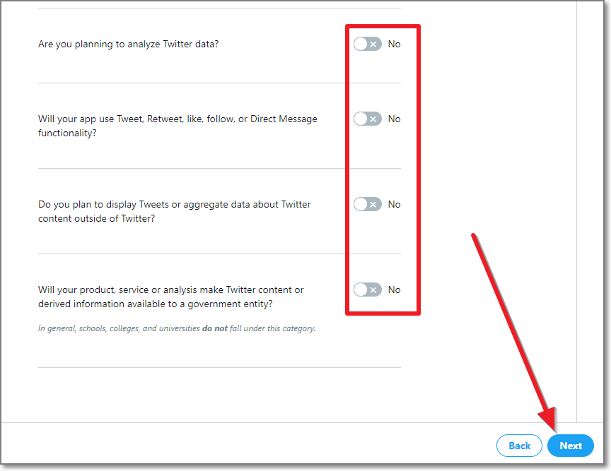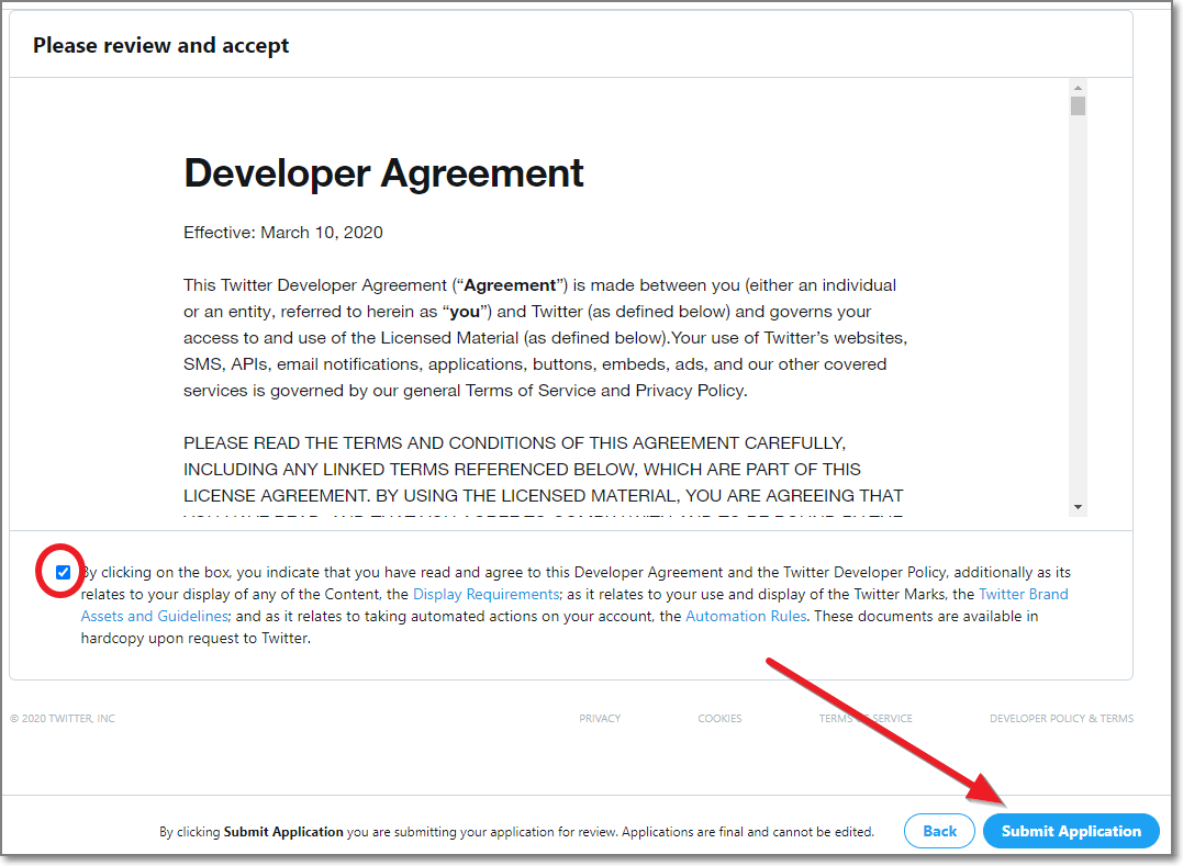 트위터에서 정한 규정이나 정책위반을 하면 강퇴시키겠다는 내용입니다. 체크하고 우측하단에 Submit Application을 클릭합니다.