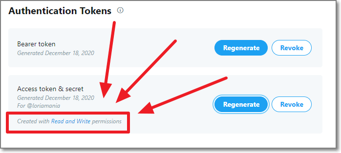 2021년 1월12일에 소비자 키가 더 이상 표시되지 않는다고 합니다. 열쇠를 선택하고 나오는 내용은 아까도 저장했지만 여기서 얻는 Access token & secret도 저장해야 합니다. 우선 한번도 만든적이 없으니 Generate를 누릅니다.