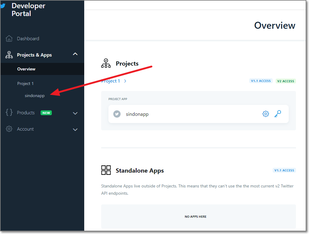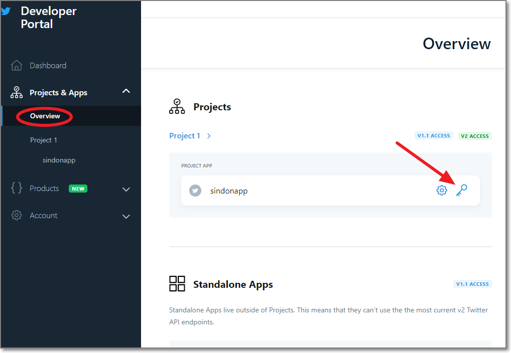 다시 앱 화면으로 돌아옵니다. 아래처럼 Overview를 클릭하고 자신의 앱이 보이면 우측에 열쇠를 클릭합니다.