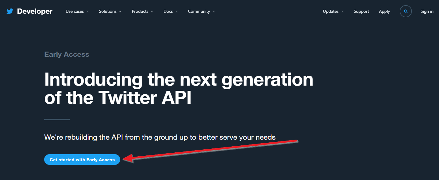 다음화면에서 차세대 트위터 api를 소개한다고 합니다. 화살표친 "Get started with Early Access"를 클릭합니다.