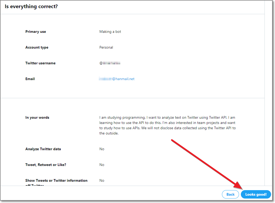 마지막 확인절차로 그동안 쓴 내용을 보여주면서 제대로 입력했는지 보라고 합니다. Looks good! 을 누릅니다.