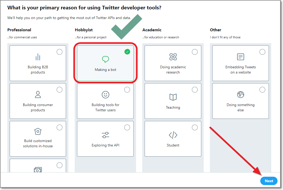 그리고 "Making a bot"을 체크하고 우측 하단에 있는 Next를 클릭합니다.