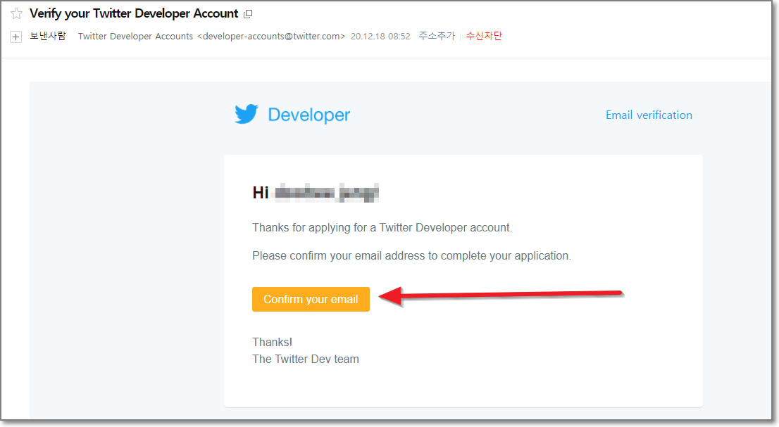메일함을 봤더니 트위터에서 메일이 와있습니다. 들어가서 컨펌(확인)을 해줍니다.
