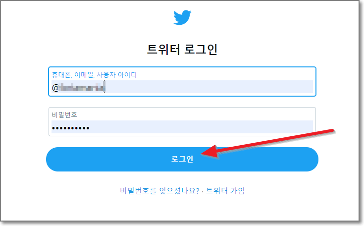 이미 만들어두고 글 쓰고, 리트윗도 하고 팔로우도 한 계정으로 로그인합니다.(휴대폰 또는 이메일 또는 사용자아이디를 입력하고 비밀번호를 입력한 후에 로그인 합니다.)