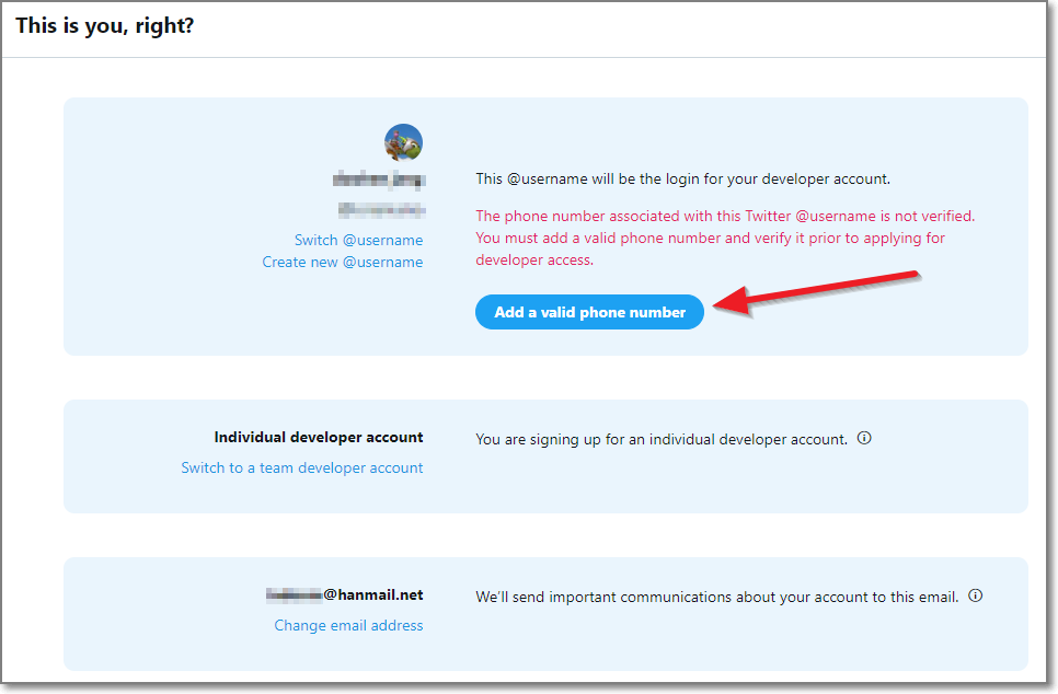 아래화면처럼 폰번호를 인증하라고 합니다. 이미 폰번호 인증을 하신 계정이라면 이 과정은 건너 뛰시고 스크롤을 내리시면 됩니다. 폰번호 인증을 하지 않으셨다면 아래의 Add a valid phone number를 클릭합니다.