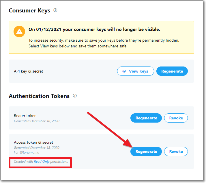 Consumer Keys가 나오는데 가장 밑에 빨간 네모 보시면 아직도 Read Only 입니다. Regenerate를 누릅니다.