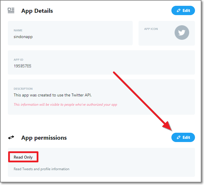 앱 상세화면이 나오는데요. 여기서 APP Permissions를 보면 Read only 라고 되어있습니다. Edit를 누릅니다.