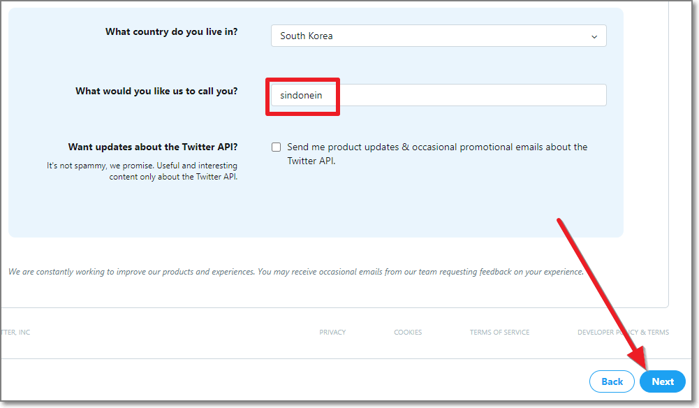 What would you like us to call you?는 일종의 닉네임을 쓰는 곳입니다. 헷갈리지 않도록 계정명과 같이 쓰거나 마음에 들고 기억할 수 있는 이름을 쓰고 국가와 닉네임을 골랐으면 우측 하단에 있는 Next를 누릅니다.