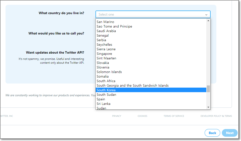 트위터 api를 사용하기 위해서는 개발자 등록을 해야 합니다. 여기서는 이미 트위터 계정은 있는 상태에서 시작하겠습니다. 만약 트위터 계정을 오늘 만드셨다면 api 등록을 하기 전에 팔로우도 3개 이상하고 글 작성(트윗)도 2개 하고 리트윗도 하고 남의 트윗에 답글도 단 후에 시작하시기 바랍니다. (이유는 트위터 api 생성하고 나서 검색 ban 당하는 경우를 줄이기 위해서 입니다.)
