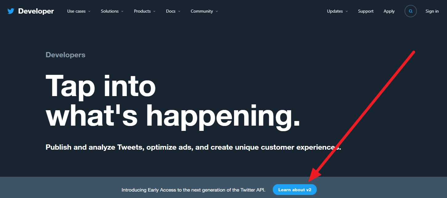 옆에 링크된 트위터 개발자 페이지로 새창을 띄웁니다. 그리고 화살표 친 Learn about V2 를 누릅니다.