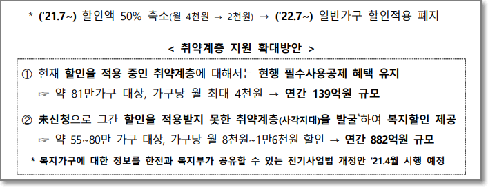 당초 도입취지와 달리 중상위 소득(81%), 1.2인가구(78%) 위주로 혜택이 제공되고 있는 주택용 필수사용공제 할인제도를 개선하여 취약계층에 대한 전기요금 지원은 보다 확대하고 일반가구에 대한 할인적용은 점진적으로 축소하여 21년7월부터는 월4천원에서 2천원으로 줄이고, 22년7월부터는 일반가구는 할인적용을 폐지하기로 하였습니다.