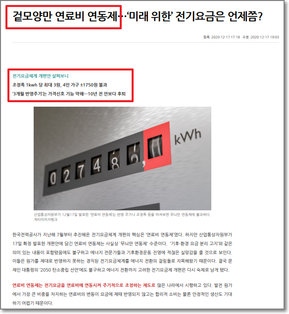 전기요금에 연료비 변동반영해도 4인가구 평균 1천원 낮아져.- 한겨례