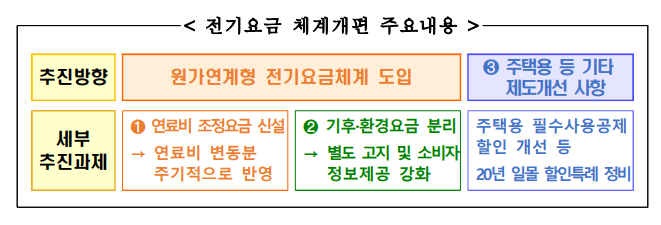 이번 12월17일에 발표된 개편안은 크게 3가지로 요약할 수 있습니다. 연료비 연동제와 기후.환경 요금 분리고지서 그리고 전기요금 할인정책 변경에 대한 내용입니다. 그러면 하나하나 자세히 알아보도록 하겠습니다.