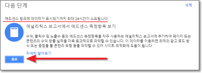 연결한다고 바로 데이터가 보이는게 아니라고 최대 24시간이 소요된다고 합니다. "완료"를 누릅니다.
