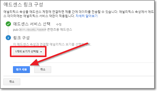 1개의 보기가 선택됨으로 된것을 보고 "링크사용"를 클릭합니다.