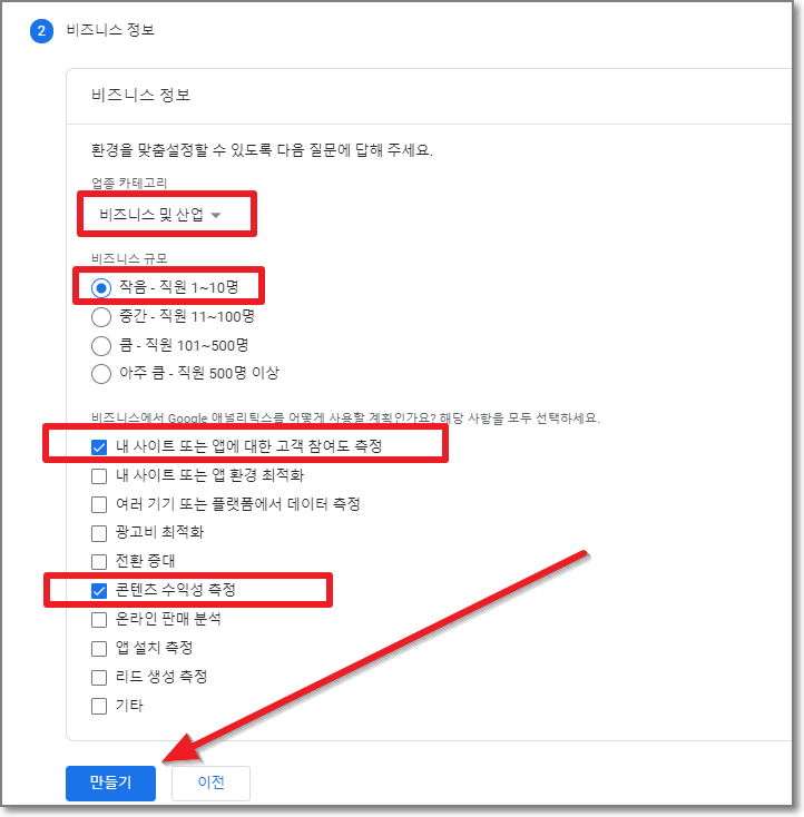 비즈니스 정보는 아래그림처럼 업종 카테고리는 비즈니스 및 산업, 규모는 작음, 체크는 "내 사이트 또는 앱에 대한 고객 참여도 측정"과 "콘텐츠 수익성 측정"을 체크하고 "만들기"를 누릅니다.