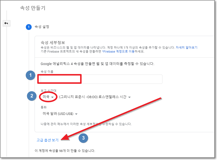 속성이름을 쓰고(자신이 구분하기 쉽게 애칭을 씁니다.) 미국을 대한민국으로 바꾸고, "고급옵션보기"를 누릅니다.