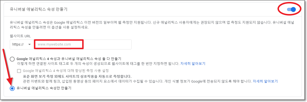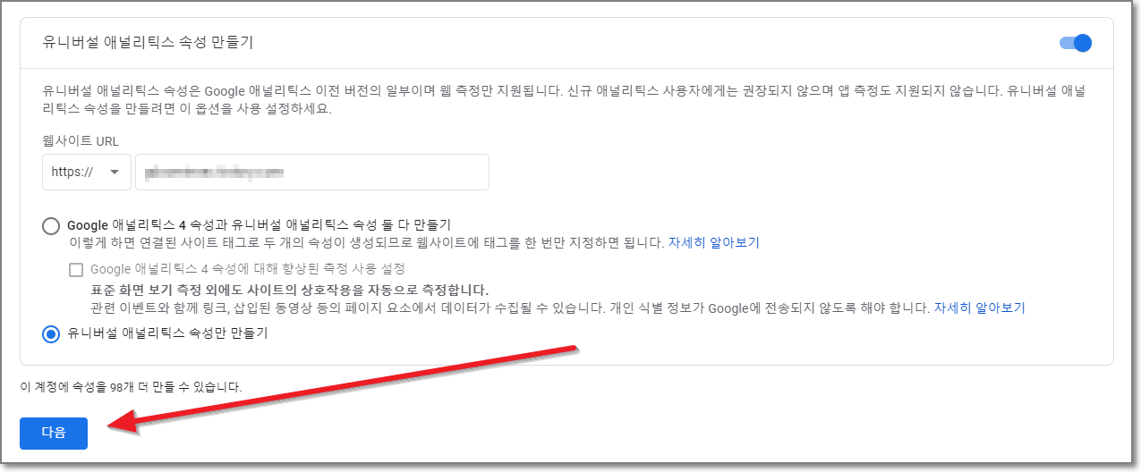 맨오른쪽 버튼은 아래그림처럼 변하게 되고, 웹사이트 즉 블로그 주소를 입력하고 보면 기본적으로 구글 애널리틱스 4속성과 유니버설 애낼리틱스 속성 둘 다 만들기에 체크가 되어있을 것입니다. 아래처럼 유니버설 애널리틱스 속성만 만들기에 체크를 합니다.