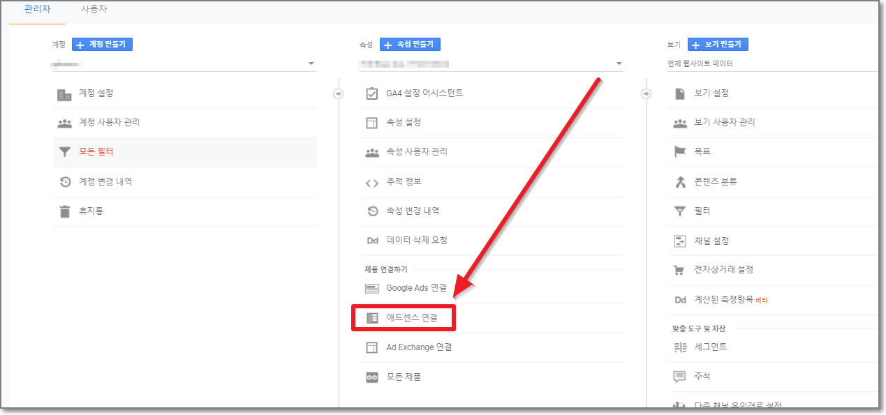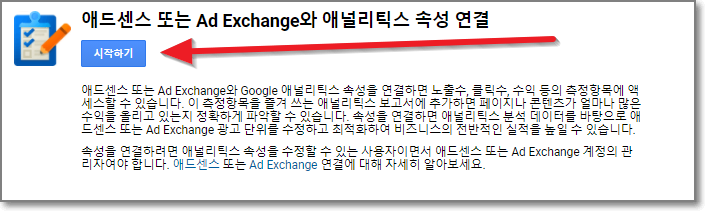 애드센스 또는 Ad Exchange와 애널리틱스 속성 연결에서 "시작하기"를 누릅니다.