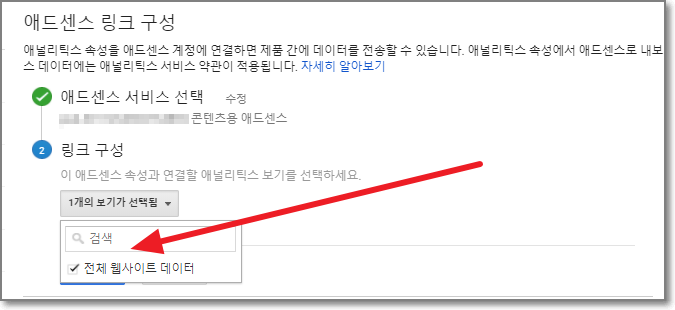애드센스 서비스 선택은 완료가 되었고, 밑에 링크 구성에서 "전체 웹사이트 데이터"를 선택합니다.