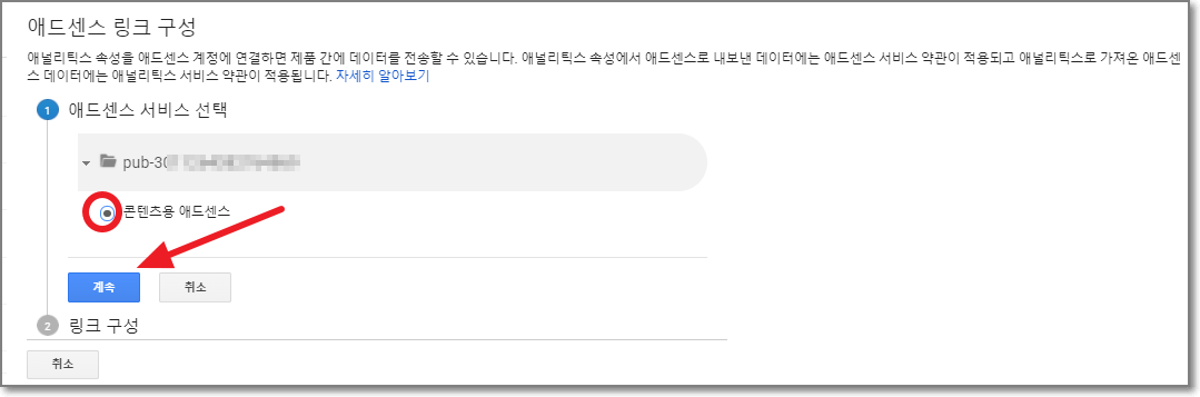 애드센스 링크 구성의 애드센스 서비스 선택에서 "콘텐츠용 애드센스"에 체크하고 "계속"을 누릅니다.