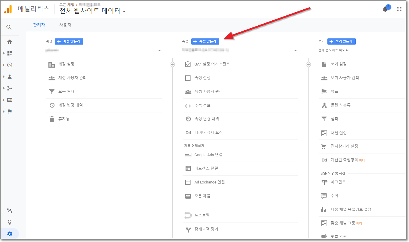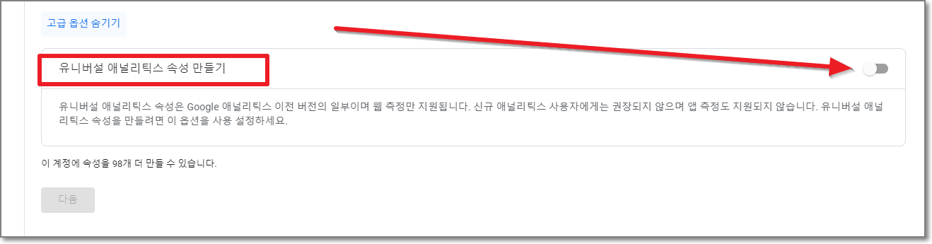 유니버설 애낼리틱스 속성 만들기의 맨 오른쪽에 있는 버튼을 클릭합니다.(버튼이 밀립니다.)