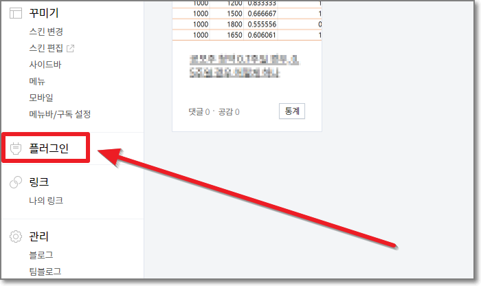 아래는 티스토리 관리자 화면입니다. 화살표친 "플러그인"을 누릅니다.