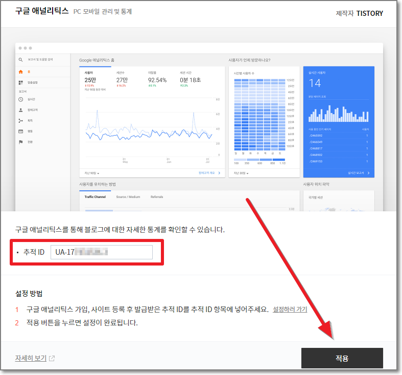 구글 애널리틱스 플러그인 화면에서 아까 복사한 UA-17***이라는 추적ID를 아래의 빨간 박스안에 붙여넣기를 하고 "적용"을 누릅니다.