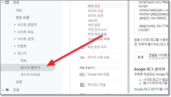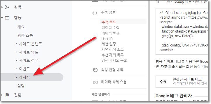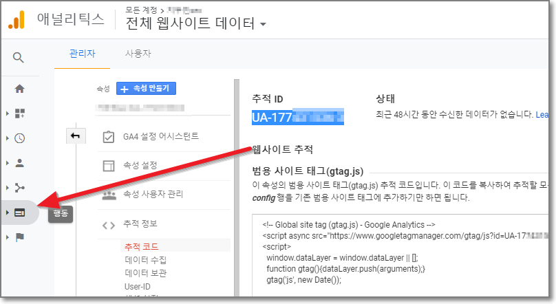 이제 다시 구글 애널리틱스 화면으로 돌아와서 왼쪽에 깃발 위에 있는 "행동"메뉴를 누릅니다.