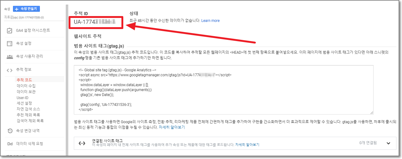 아래처럼 추적ID가 모습을 드러냅니다. UA-17***라고 쓰인 추적 아이디를 마우스로 긁어서 복사합니다.