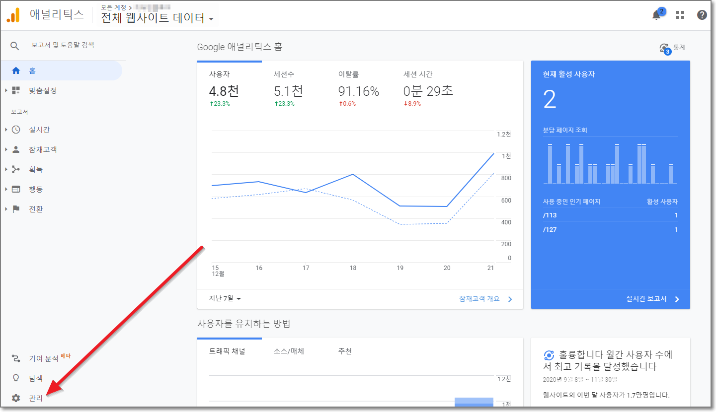 당연히 제일먼저 구글 애널리틱스를 열어야 합니다. 애널리틱스 링크는 따로 하지 않겠습니다.