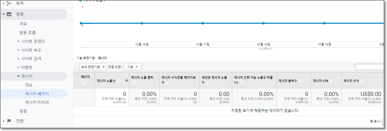 아까 위에서 한번 해봤던 것처럼 "행동", "게시자", "게시자페이지"를 보면 페이지에서 나오는 수익이 보이게 됩니다. 처음 연결했으니 24시간 뒤에 말이죠.