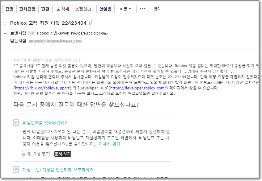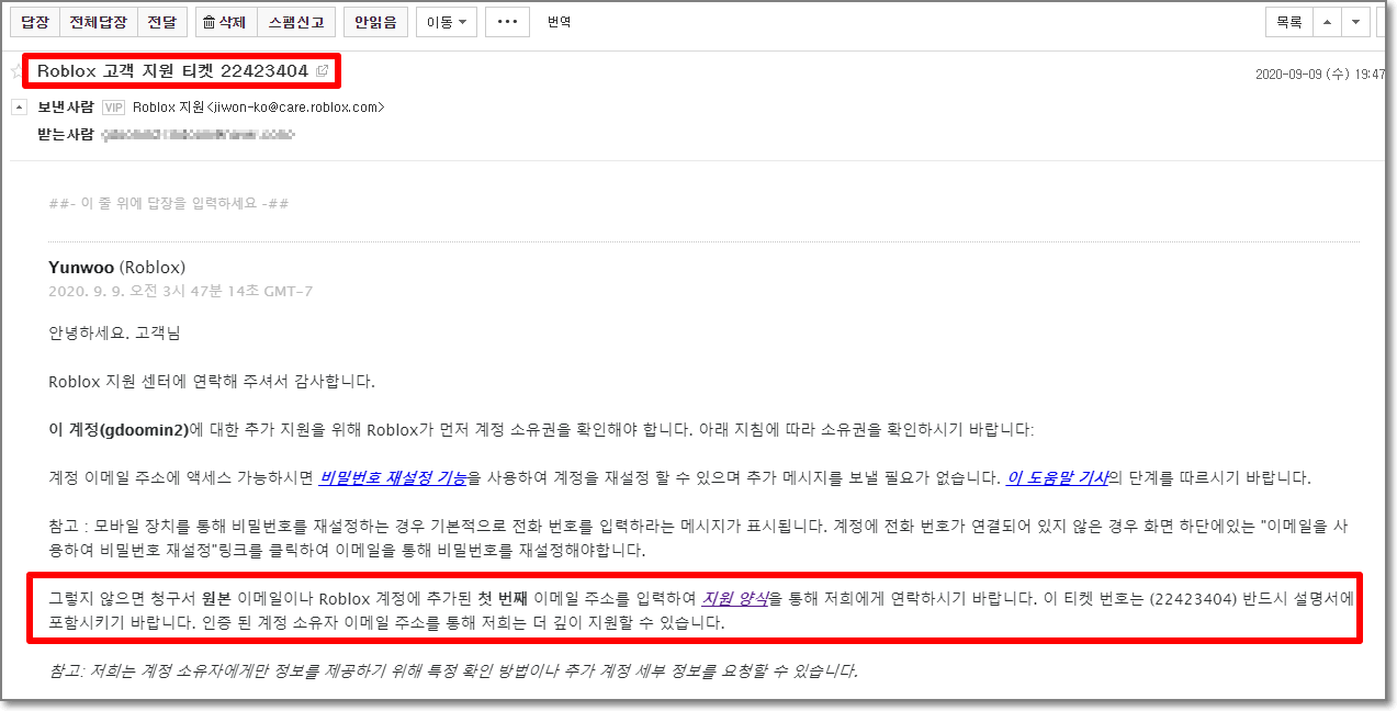 드디어 답장이 하루만에 왔습니다. 내용은 빨간 박스친 내용인데요. 요약을 하면, 현질을 했을 때 즉 아이템을 샀을 때 카드로 샀을 텐데요. 그 청구서를 첨부해야 합니다. 내용에는 지원양식을 통해 문의하라고 했지만 이메일 그대로 답장 버튼을 눌러서 아이템을 산 영수증을 첨부하면 됩니다.