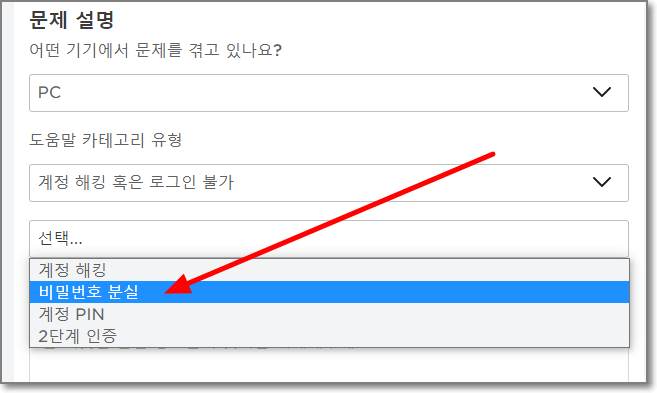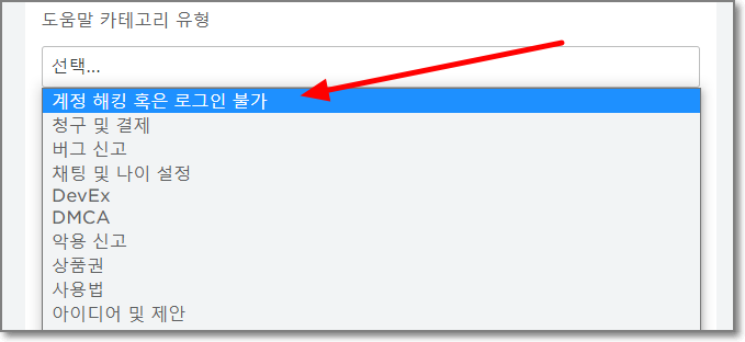 도움말 카테고리 유형에는 "계정 해킹 혹은 로그인 불가"를 선택합니다.